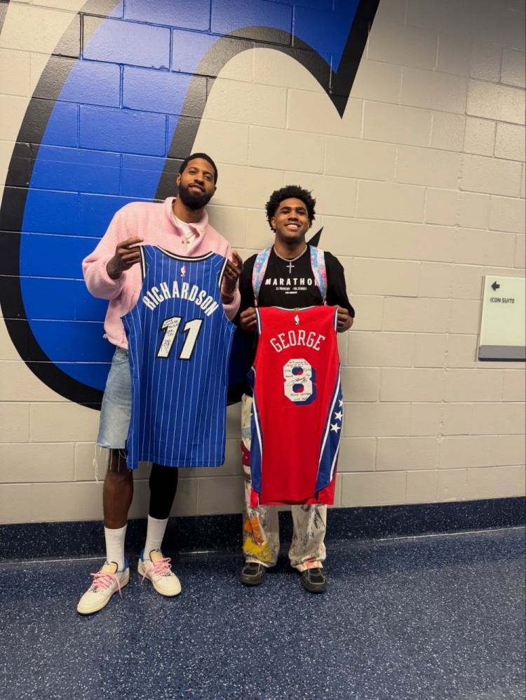 1月11日讯 昨日,76人客场103-91击败魔术,赛后乔治和魔术新秀杰斯·理查德森交换球衣并合影。